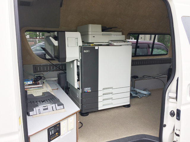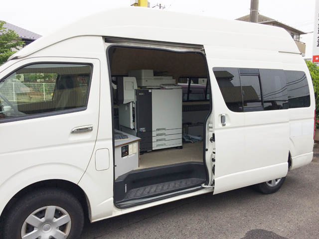 毎分160枚(A4用紙)の高速カラープリンターを、低ランニングコストで使用いただけます。実機をデモカーに乗せて、お客様のもとへお伺いします。